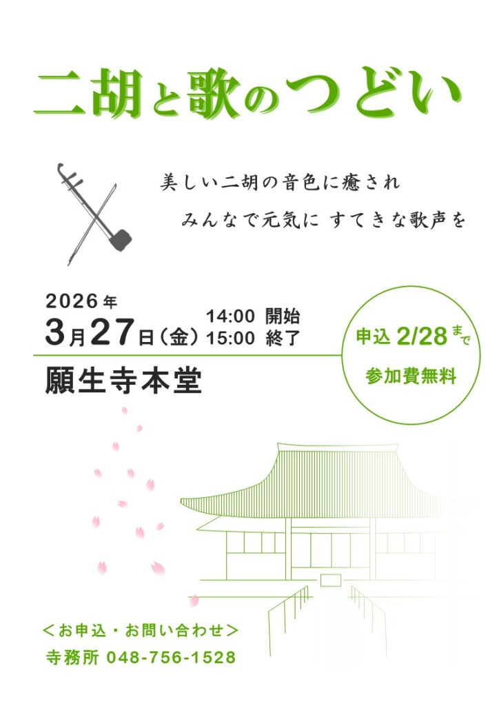 第6回 二胡と歌のつどいBy 願生寺 / 2026年2月15日 令和8年(2026)3月27日金曜日午後2時より本堂にて『二胡と歌のつどい』を開催します。美しい二胡の音色に癒やされ、懐かしい歌をみんなで歌いましょう!どなたでも参加できます。人数の把握のために事前にお申し込みください